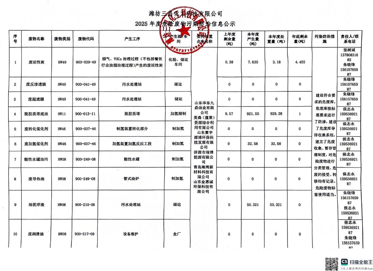 濰坊三昌化工科技有限公司2025年度危險(xiǎn)廢物污染防治信息公示